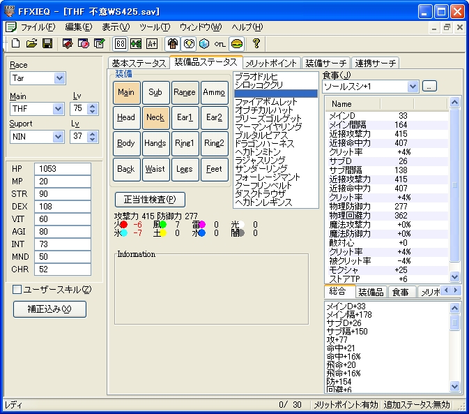 メリポ…短剣スキル8 射撃スキル8 クリ率4 被クリ率4 STR5 不意5 トリプルアタック5